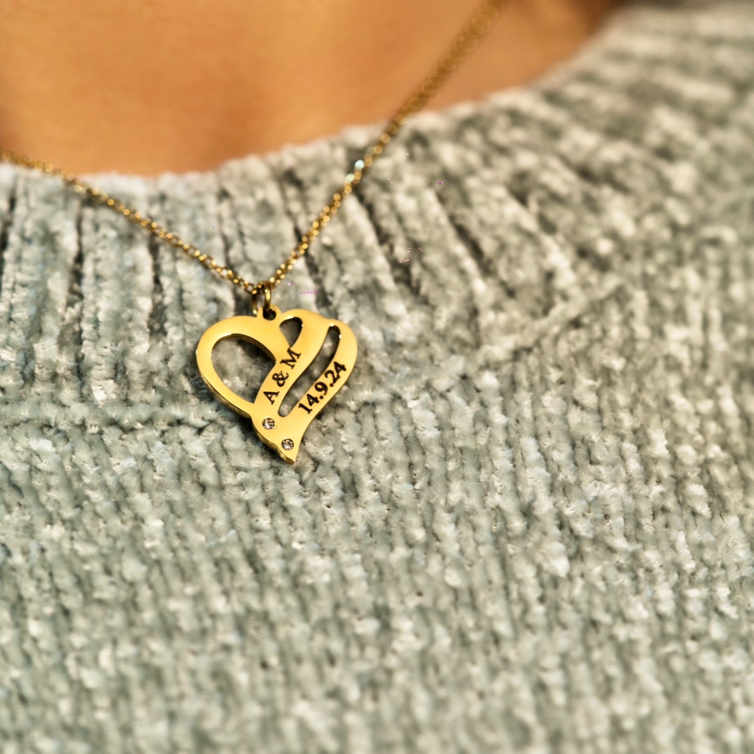 Collar elegante con dije de corazón grabado con iniciales y fecha especial. Fabricado en acero inoxidable dorado, resistente y perfecto para uso diario.